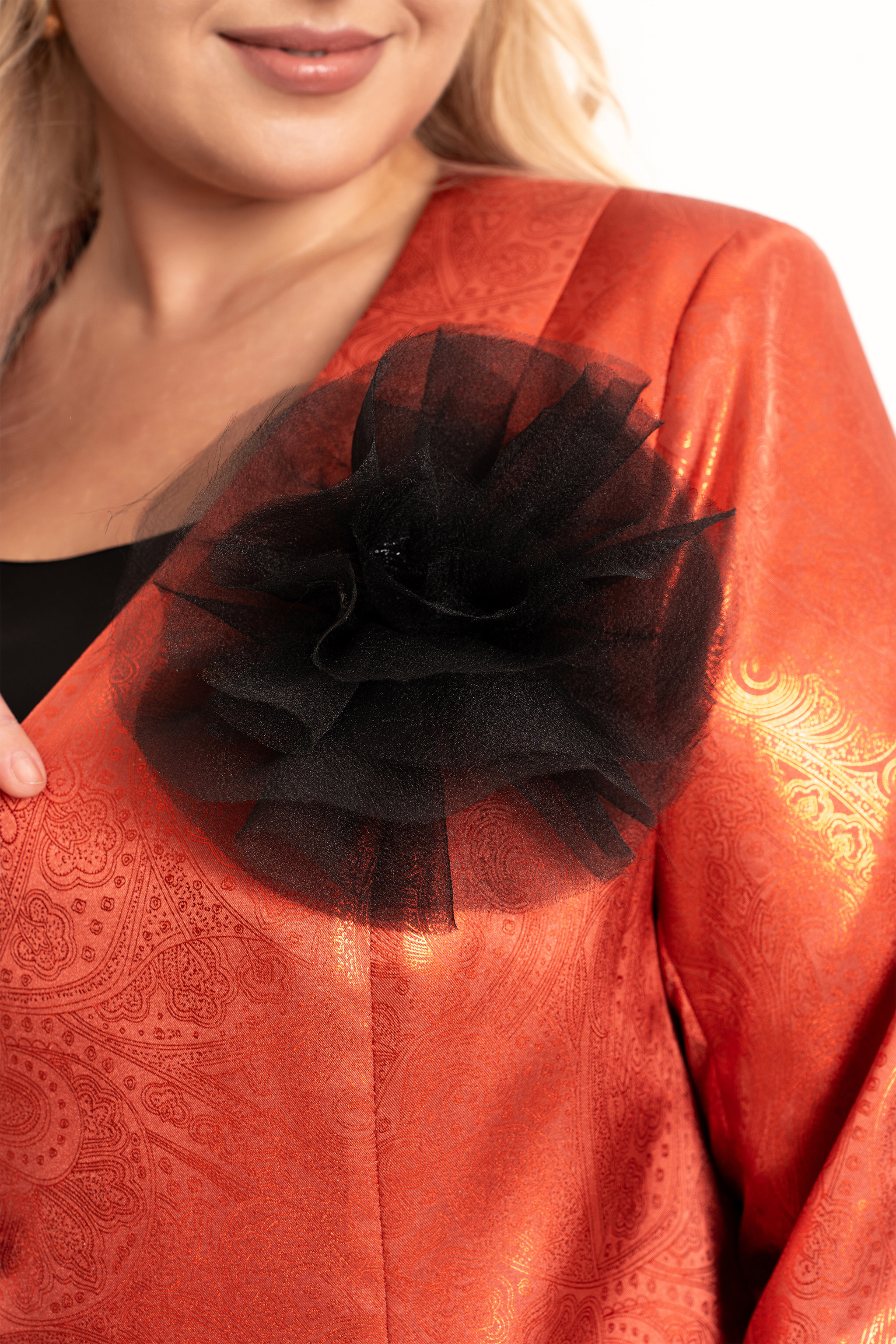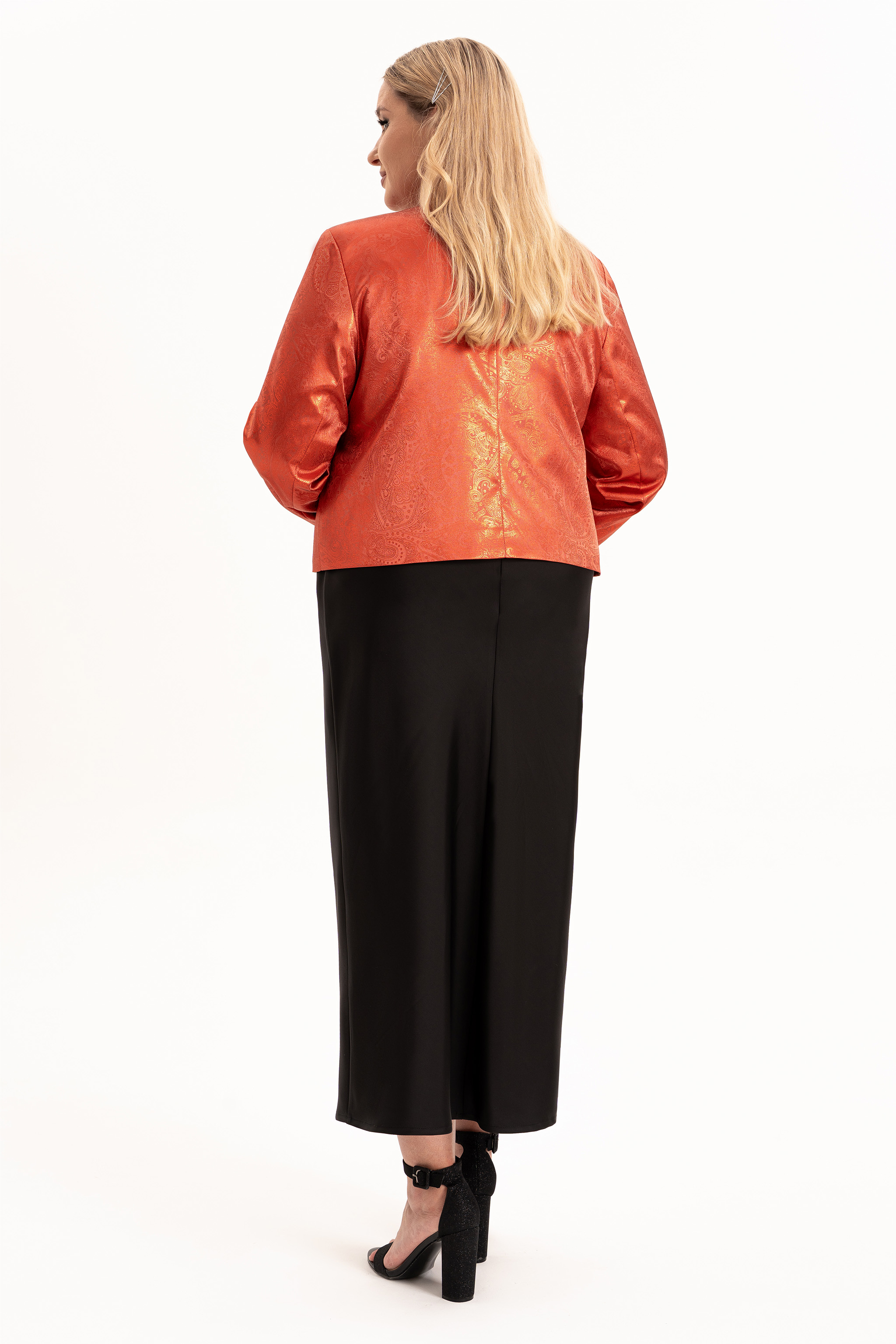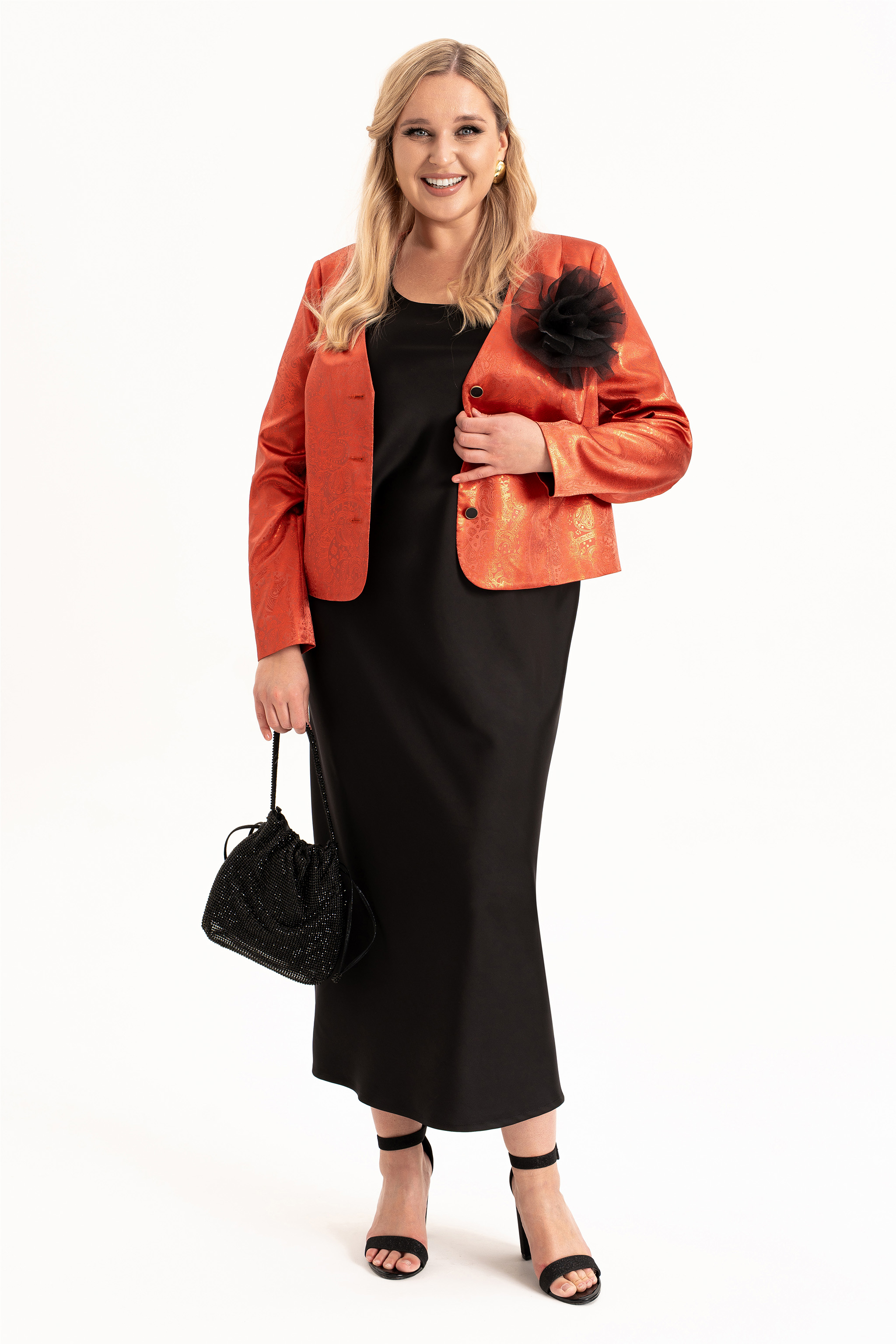 Элегантный женский комплект «двойка» больших размеров — идеальный выбор для женщин с пышными формами, который сочетает в себе комфорт, стиль и изящество. Модель состоит из двух элементов: лаконичного  платья из струящегося атласа, кроеного  по косой и  короткого жакета, полуприлегающего силуэта на подкладке. Такой тандем создает утонченный и женственный образ, который прекрасно подойдет как для вечерних выходов, торжеств, так и для повседневного ношения или работы в офисе.  Жакет полуприлегающего силуэта,  с центральной застёжкой на петли и  пуговицы и с рельефами от плеча по переду, закругленный низ борта. Спинка в жакете со средним швом . Рукав втачной, двухшовный, длинный.  Платье кроенное по косой, что обеспечивает красивую посадку и мягкое облегание по фигуре. Углубленная горловина добавляет лёгкой чувственности, а нагрудные вытачки от проймы подчёркивают линию груди.  В комплекте идет съемный цветок- брошь.