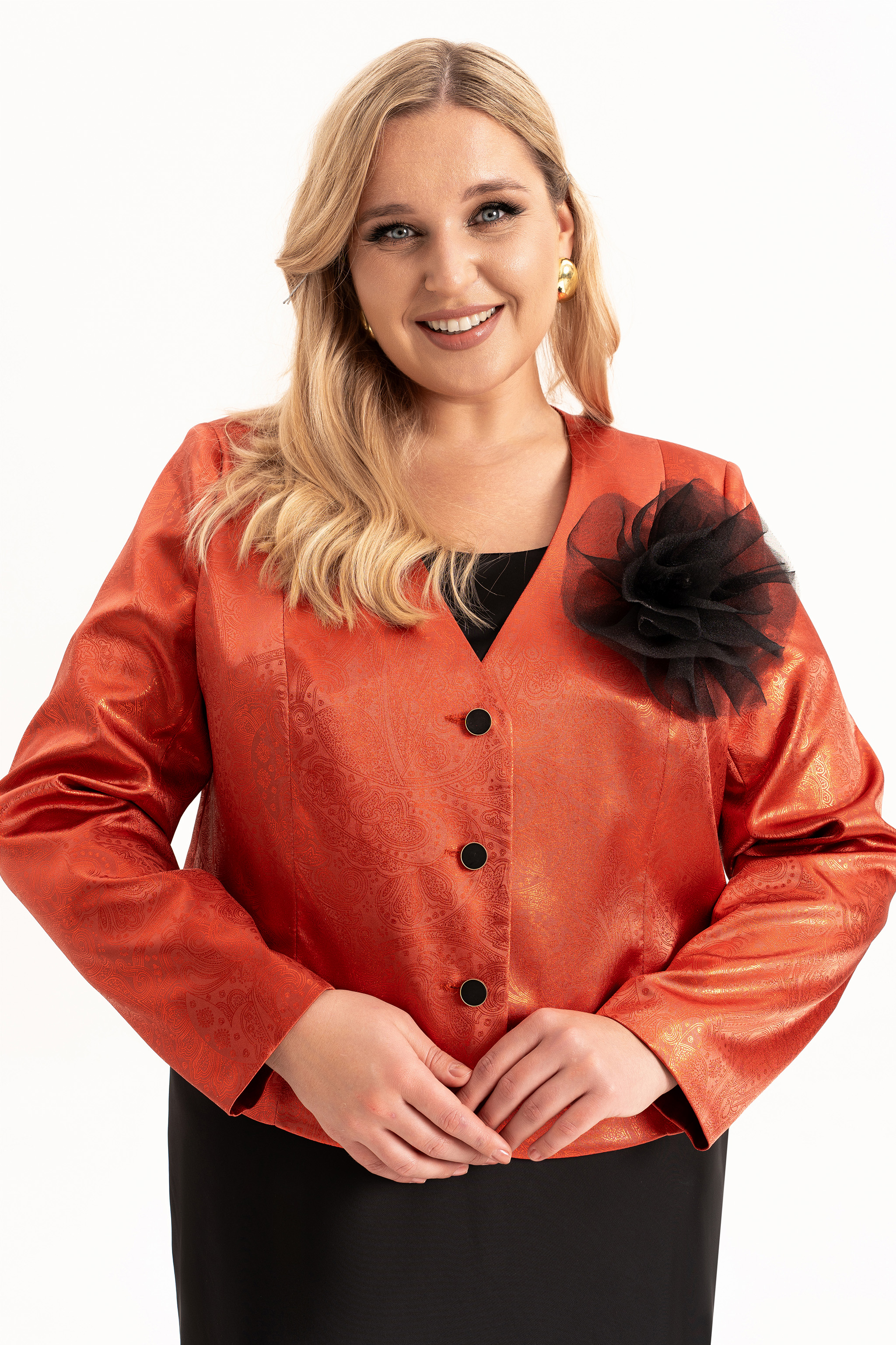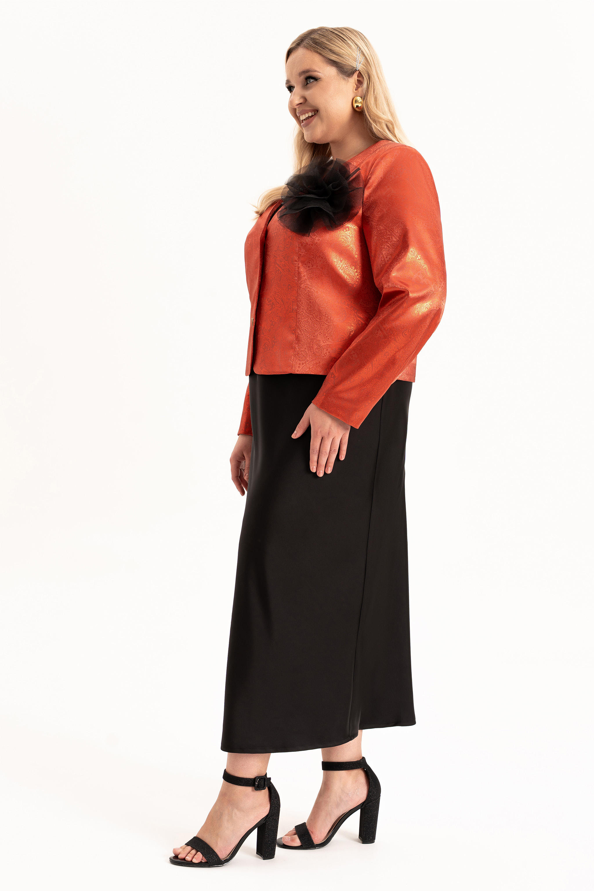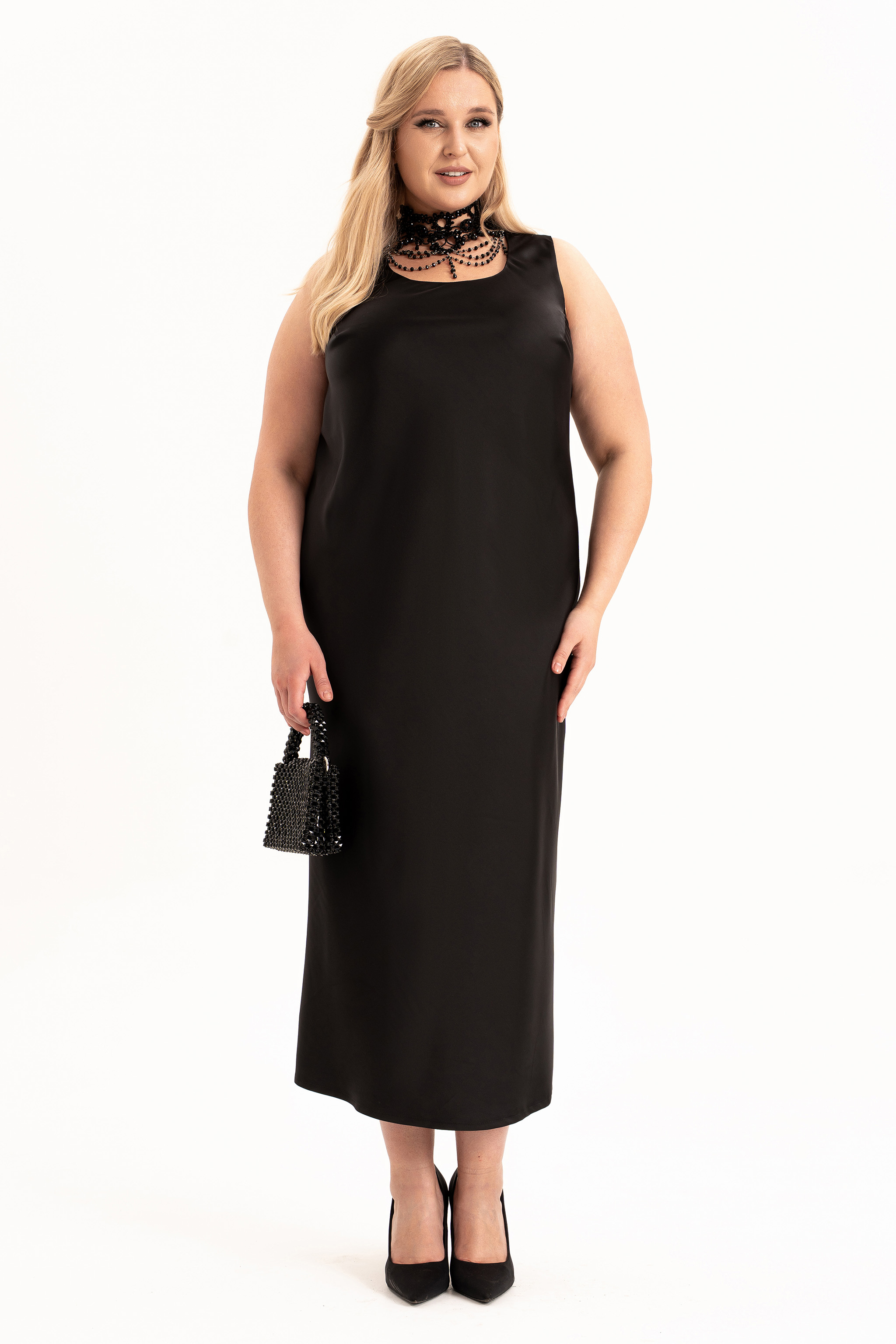 Элегантный женский комплект «двойка» больших размеров — идеальный выбор для женщин с пышными формами, который сочетает в себе комфорт, стиль и изящество. Модель состоит из двух элементов: лаконичного  платья из струящегося атласа, кроеного  по косой и  короткого жакета, полуприлегающего силуэта на подкладке. Такой тандем создает утонченный и женственный образ, который прекрасно подойдет как для вечерних выходов, торжеств, так и для повседневного ношения или работы в офисе.  Жакет полуприлегающего силуэта,  с центральной застёжкой на петли и  пуговицы и с рельефами от плеча по переду, закругленный низ борта. Спинка в жакете со средним швом . Рукав втачной, двухшовный, длинный.  Платье кроенное по косой, что обеспечивает красивую посадку и мягкое облегание по фигуре. Углубленная горловина добавляет лёгкой чувственности, а нагрудные вытачки от проймы подчёркивают линию груди.  В комплекте идет съемный цветок- брошь.