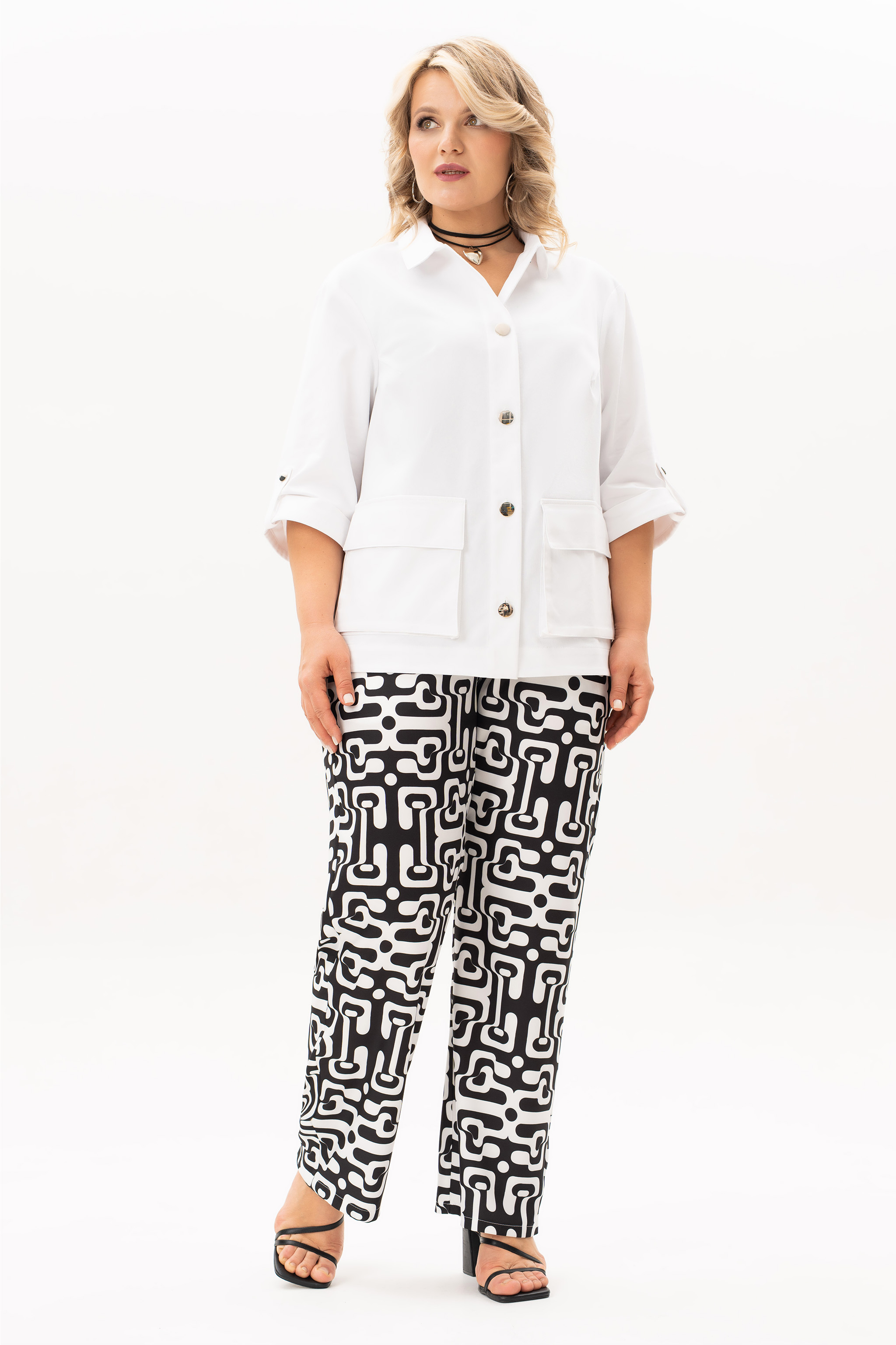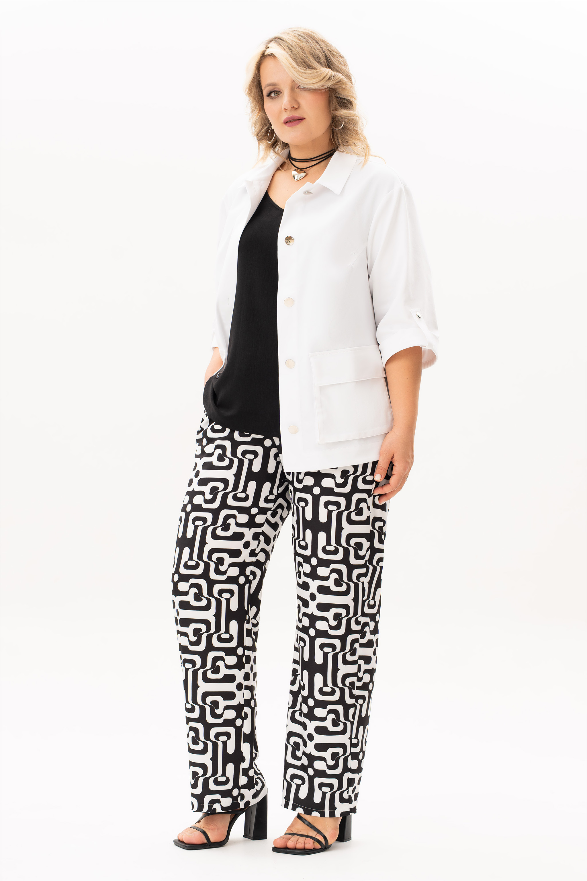 Стильный, современный, трендовый комплект с джинсовой курточкой , брюками и блузв для повседневной носки, торжественного мероприятия, в офис, школу или на прогулку. Приобретая один комплект, Вы покупаете несколько образов, каждая единица которого универсальна, поэтому может сочетаться со многими вещами из Вашего гардероба. Стильный вариант для красивого женского образа – сочетание белого джинсового жакета с брюками прямого кроя из принтованной ткани и контрастной майкой. Жакет-куртка прямого кроя с рельефными швами и кокетками по переду и спинке. Накладные карманы с клапанами и декоративные металлизированные пуговицы - узнаваемые нотки вневременной джинсовой мелодии. В рукавах предусмотрены паты с пуговицей, что позволяет сделать рукава короче. Жакет просто необходим при создании как романтического, так и спортивного образа. Майка с рукавом «крылышко», горловина углубленная V-образной формы. Брюки прямого кроя с боковыми карманами и поясом частично на резинке. Не упустите возможность приобрести брючный комплект с большим выбором размеров и ощутить комфорт в носке качественной и стильной одежды!