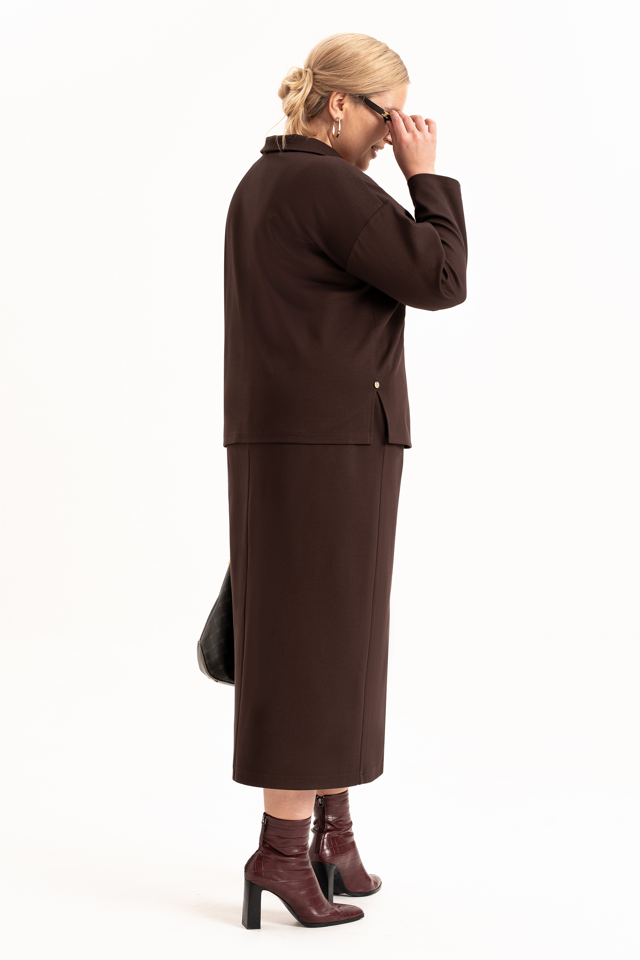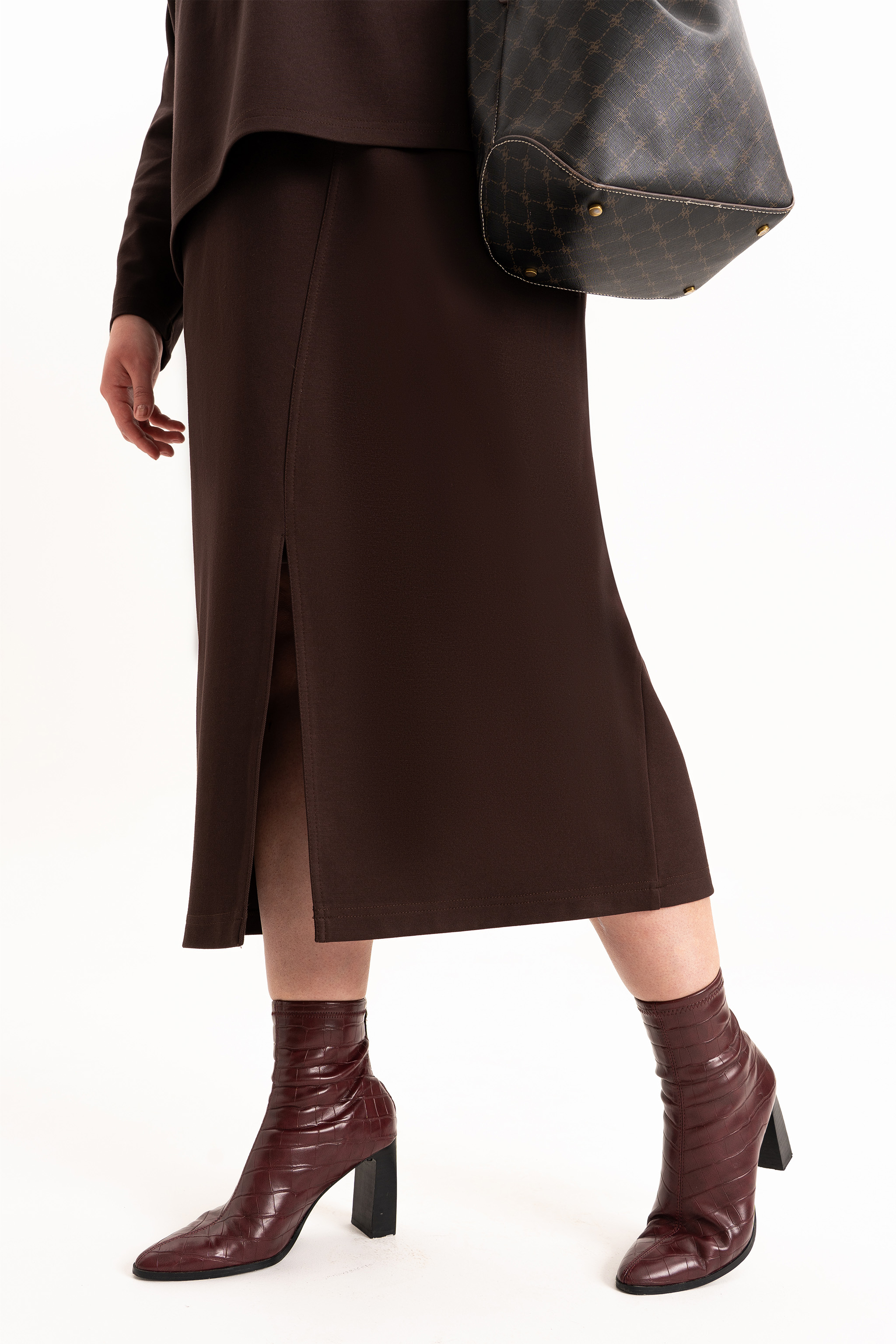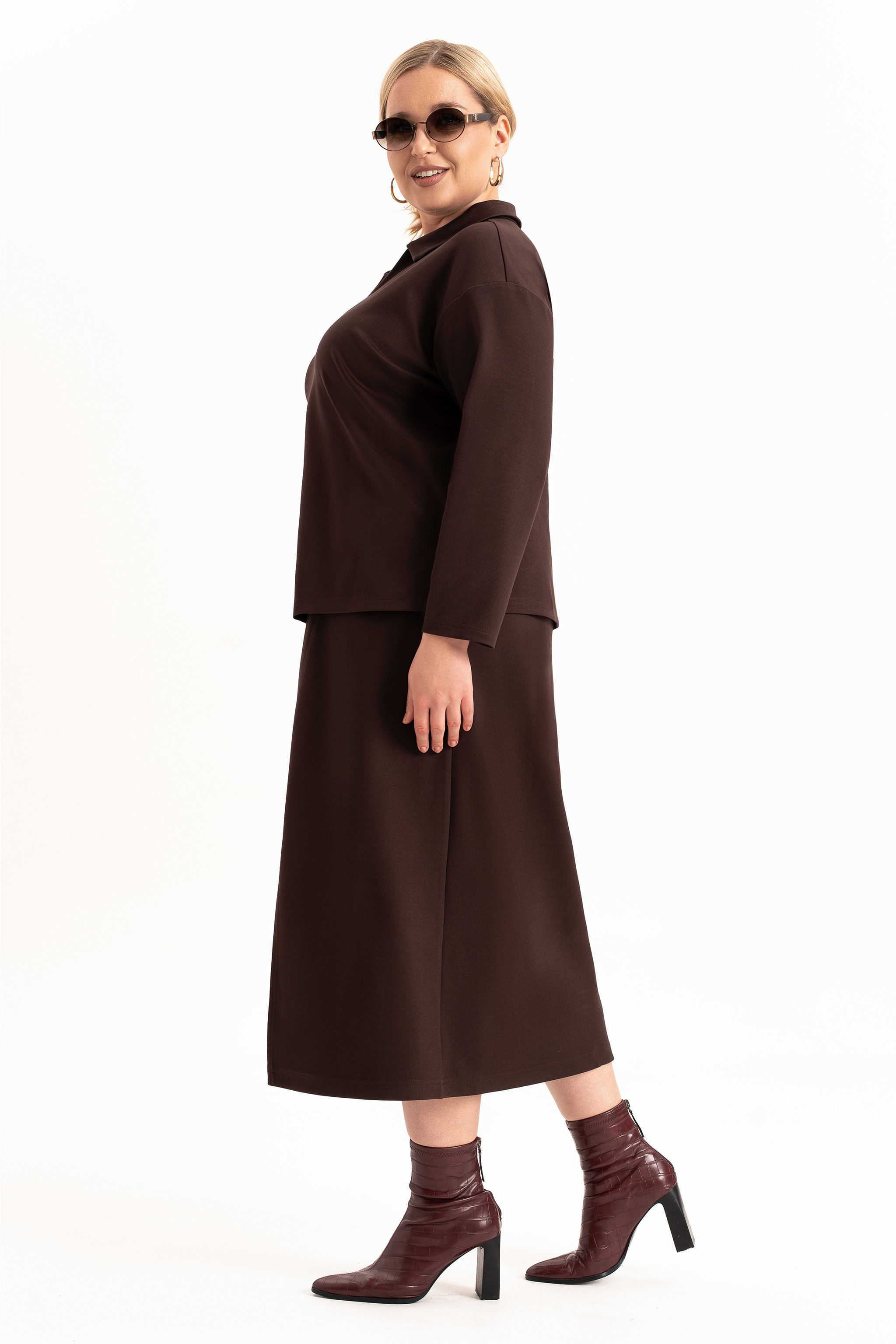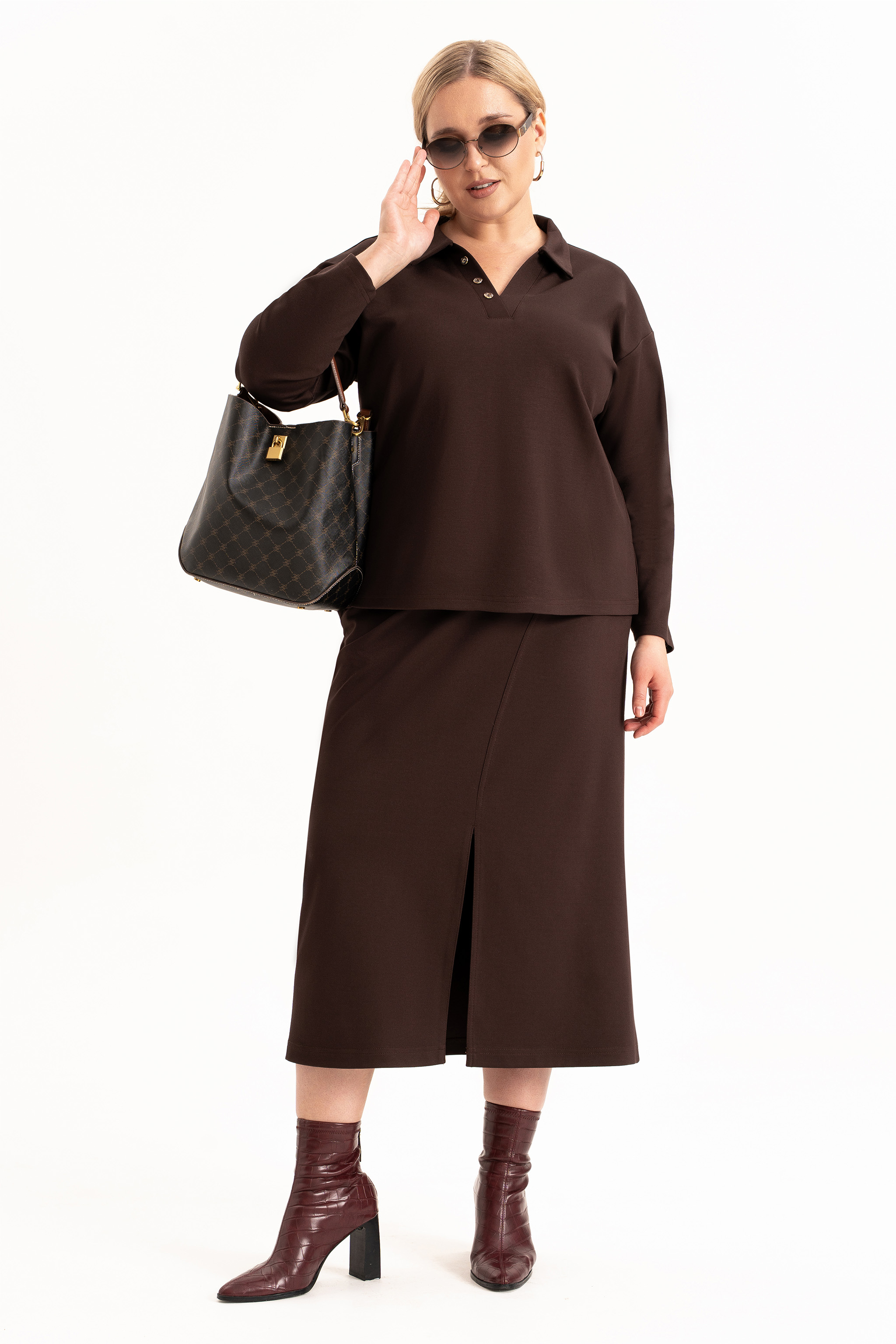 Стильный женский трикотажный костюм с юбкой станет настоящей находкой для каждой современной модницы. Удобный и практичный женский  костюм оверсайз прекрасно подходит для любого типа фигуры, помогая выгодно скрыть недостатки и подчеркнуть достоинства. Приталенный силуэт трикотажной юбки с высокой посадкой, а также свободный крой свитшота сделает образ лаконичным, поможет всегда оставаться в тренде. Неповторимый стиль и удивительный комфорт умело сочетаются в этом женском  костюме с юбкой. Женский  костюм отлично подходит для повседневной носки, а также для более формальных ситуаций. Этот костюм идеально подходит как для офисной среды, так и для обеденного свидания или других повседневных мероприятий. Вы сможете легко создать разнообразные образы, изменяя аксессуары и обувь. В нем каждая сможет чувствовать себя комфортно. Удобный крой позволит не сковывать движения, при этом полноценно облегая силуэт женской фигуры. Костюм выполнен с учетом последних модных тенденций, что обеспечивает его стильный дизайн. Высококачественный трикотажный материал »лакоста», используемый при создании, придает костюму особую мягкость и удобство во время носки. Юбка с разрезом по цетру переднего полотнища и боковыми карманами добавляет нотку женственности и элегантности к образу. Горловина свитшота V-образная с обработанными планками и воротником, с боковыми разрезами и пришивным декором. Свитшот оверсайз отличается не только свободным кроем, но и имеет спущенную линию рукава, выгодно скрывая мельчайшие недостатки женской фигуры.