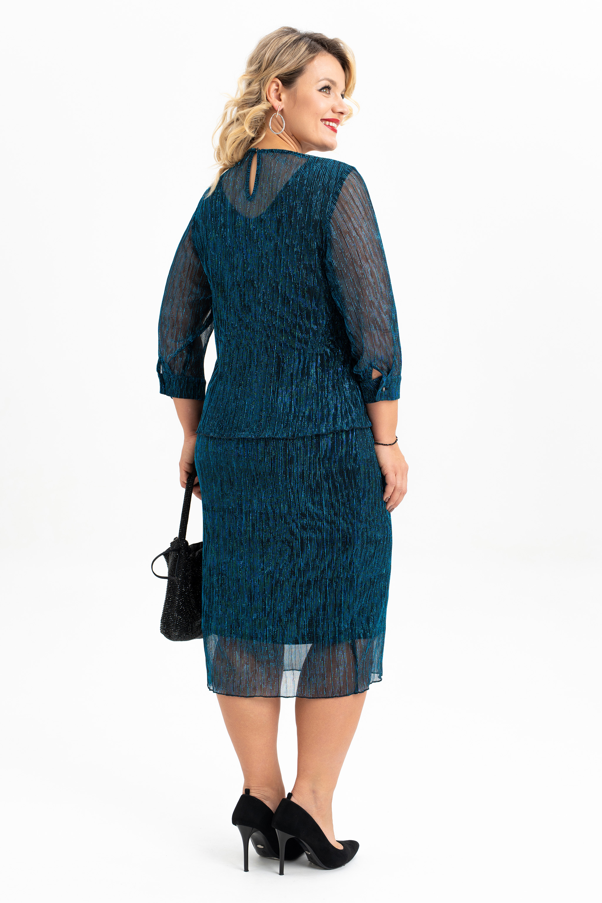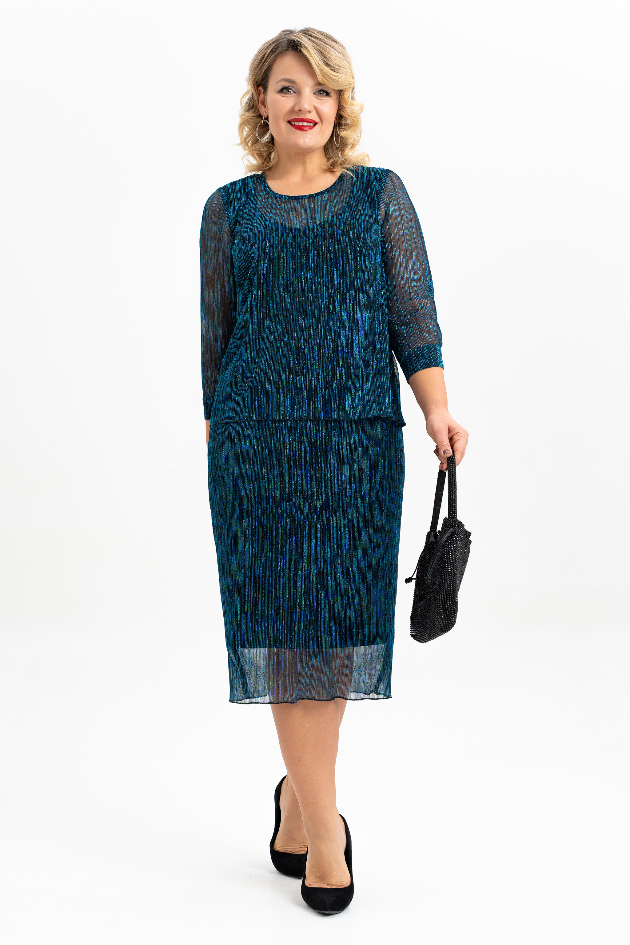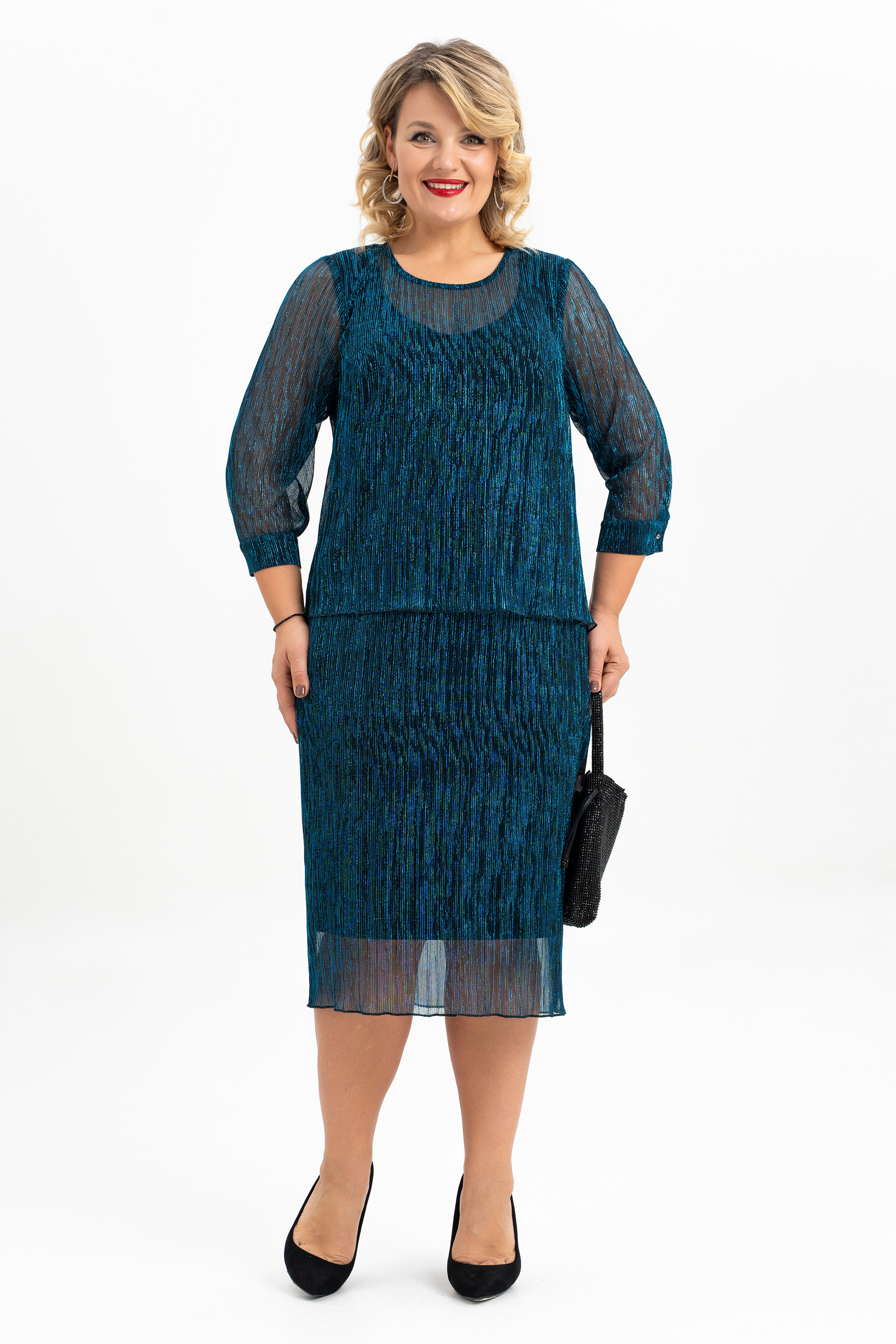 Элегантное плиссированное платье – стильный must-have для вашего праздничного гардероба! Полуприталенный силуэт и длина ниже колена делают это платье универсальным и практичным. Благодаря отлетным деталям переда и спинки, оно выглядит как изысканный костюм, сохраняя при этом легкость и комфорт. Мягкая плиссированная ткань и подкладка "масло" не сковывают движений, обеспечивая удобство в течение всего дня. Декоративная капелька на пуговицу по среднему шву спинки. Втачные рукава с элегантными манжетами на две декортивные пуговицы. Идеально подходит для торжественных мероприятий. Это платье будет великолепно смотреться в нарядном или молодежном стиле, дополняя Ваш образ в любое время года и любом мероприятии- день рождения, Новый год, свадьба и многие другие.