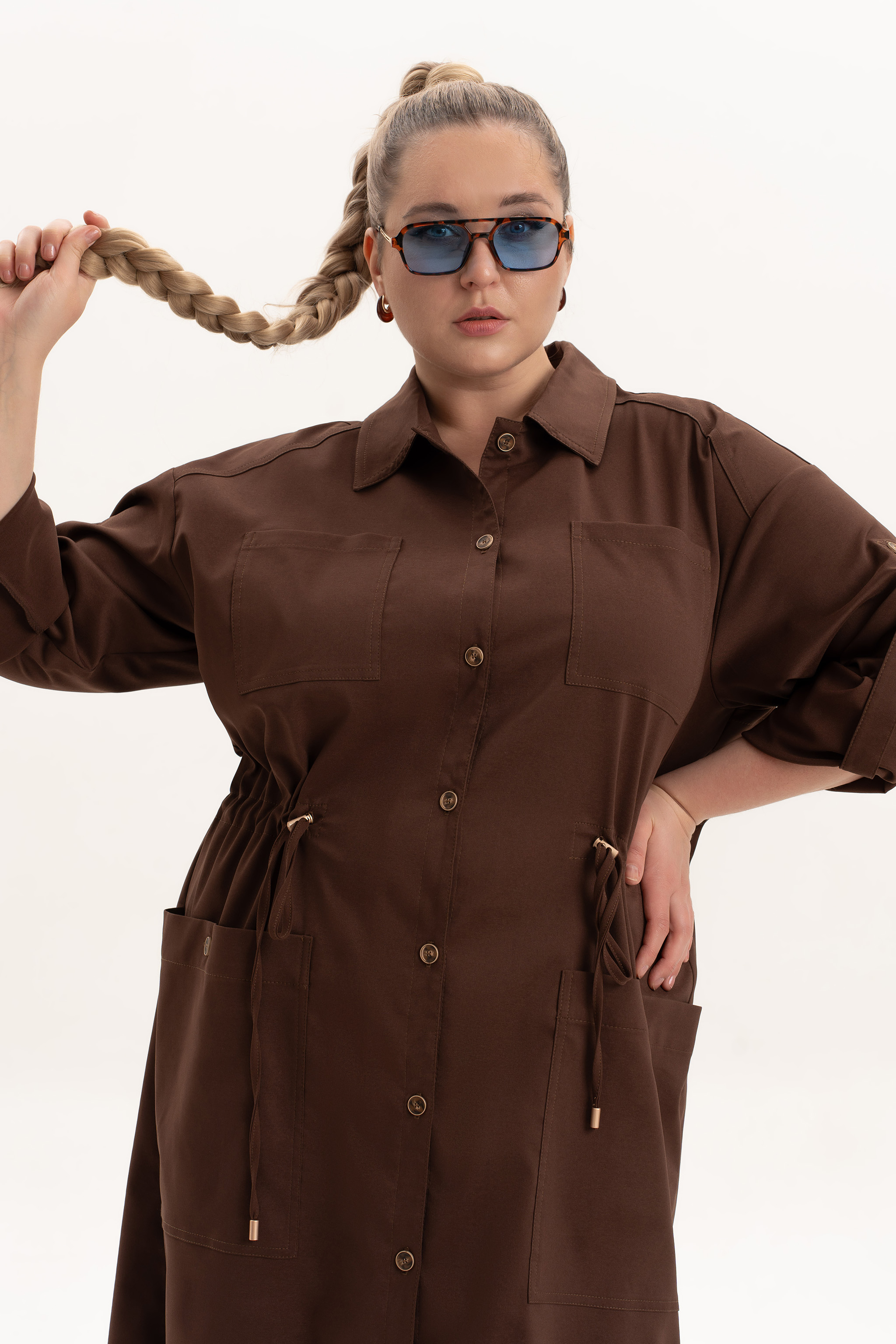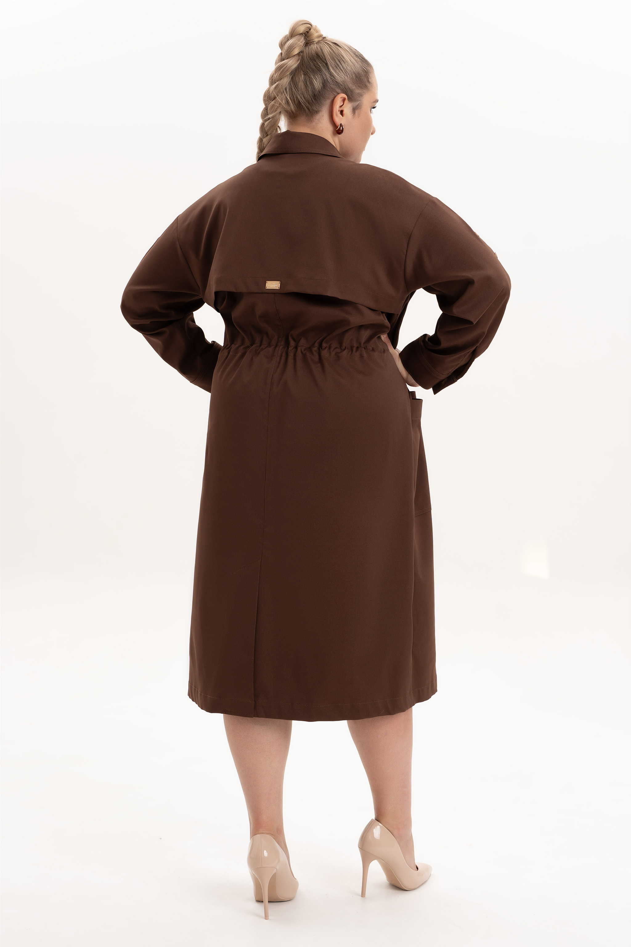 Платье офисное повседневное представляет собой идеальный выбор для женщин ищущих комфорт и стиль в ежедневной одежде. Это платье-плащ с застёжкой на петли и пуговицы, поясом на кулисе, добавляющими удобство в носке и возможность адаптации к различным фигурам. Благодаря универсальности, наряд можно носить и на работу, в офис, на прогулку и в ресторан. По спинке имеется средний шов, шлица и отлитная кокетка в верхней части спинки. Особенностью этой модели является декоративная кокетка , напоминающая плащ. Длинные рукава с манжетами и патами на петли и пуговицы, что позволяет регулировать длину рукава, гармонично дополняют классический фасон платья с воротником рубашечного типа. Большие накладные карманы и маленькие нагрудные по переду платья добавляют удобства в носке.Свободный оверсайз силуэт делает это платье универсальным. Такое платье призвано подчеркнуть природную женскую красоту и грацию, а также безупречный вкус его обладательницы.